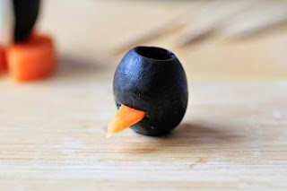 Συνδέστε την ελιά και το καρότο με μια οδοντογλυφίδα. Στη συνέχεια κόψτε μια μικρή τρύπα σε κάθε μια από τις μικρές ελιές. Τοποθετήστε το τριγωνικό τμήμα του καρότου στην τρύπα. Η μύτουλα είναι έτοιμη! Τοποθετήστε τη μικρή ελιά πάνω από τη μεγάλη.